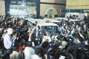 孟加拉國反對黨領導人被執(zhí)行死刑 4月11日,在孟加拉國首都達卡,人們圍住運送卡馬魯扎曼尸體的救護車。當晚,孟加拉國反對黨伊斯蘭大會黨領導人卡馬魯扎曼在首都達卡中央監(jiān)獄被執(zhí)行死刑。新華社發(fā)