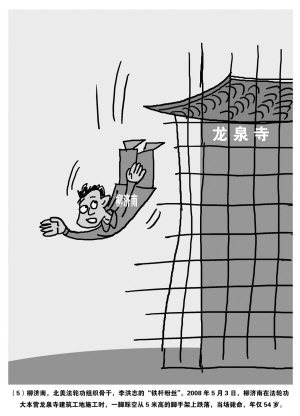 ?、?nbsp;柳濟(jì)南,北美法輪功組織骨干,李洪志的鐵桿粉絲。2008年5月3日,柳濟(jì)南在法輪功大本營龍泉寺建筑工地施工時,一腳踏空從5米高的腳手架上跌落,當(dāng)場斃命,年僅54歲。(漫畫作者 星雨)