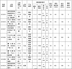 備注:1.2013013、2013014、2013017、2013022、2013037、2013038、2013039宗地位于產(chǎn)業(yè)集聚區(qū)內(nèi),屬兩層以上標準化廠房建設(shè)用地,投資強度≥3750萬元/公頃。地上有部分違法建筑物,經(jīng)政府辦、發(fā)改委、財政局、監(jiān)察局、法制辦、住建局、審計局、房產(chǎn)辦、規(guī)劃辦、城市綜合執(zhí)法局和縣產(chǎn)業(yè)集聚區(qū)管委會集體研究,地上建筑不再作價與土地捆綁出讓,由土地競得人無償處置地上建筑物。土地出讓合同簽訂后,8個月內(nèi)必須開工建設(shè),工期24個月,土地成交價款需在土地出讓合同簽訂后60日內(nèi)繳清,交地時間在3個月內(nèi)。