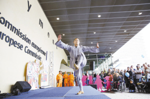 “中國(guó)角”首次現(xiàn)身歐盟開(kāi)放日      5月9日,在比利時(shí)首都布魯塞爾歐盟委員會(huì)大樓下,中國(guó)武僧表演功夫。當(dāng)日是歐盟一年一度的開(kāi)放日。因今年恰逢中歐建交40周年,中國(guó)成為歐盟成員國(guó)外唯一一個(gè)開(kāi)設(shè)宣傳角的國(guó)家,也是1993年歐盟舉辦開(kāi)放日以來(lái)中國(guó)首次參加,為今年的開(kāi)放日增添了不少中國(guó)元素。新華社發(fā)