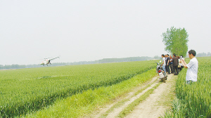 5月7日,一架小型直升機為小麥噴灑農藥。當前,正是小麥 “一噴三防”的關鍵時期,項城市三店鎮(zhèn)多方聯(lián)系,引進小型直升機為小麥高產示范田噴灑農藥,為豐產豐收奠定良好基礎。董方靈 攝
