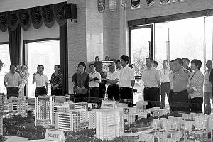 羅文閣在商務中心區(qū)規(guī)劃沙盤前聽取項目進展情況匯報。丁宇濤 攝