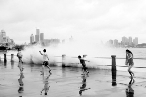 7月12日,人們躲避青島海邊巨浪。                            新華社發(fā)