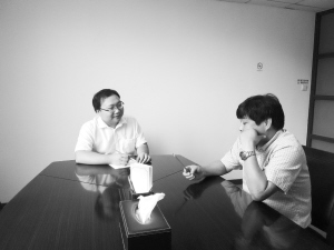 龐少磊與代理人在討論訴訟細節(jié)。